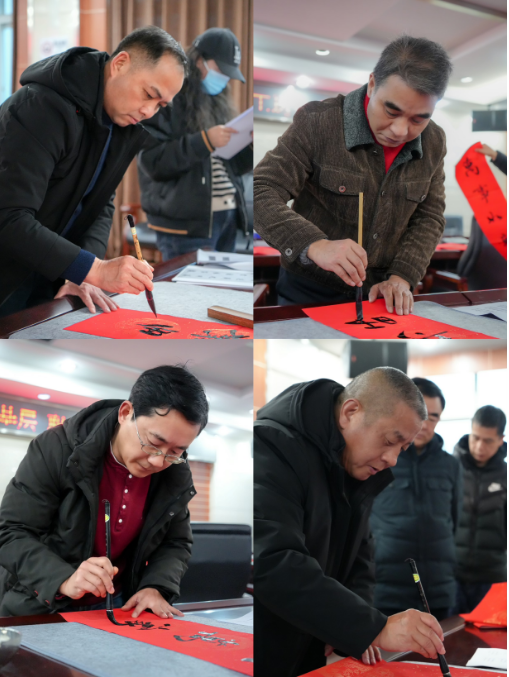此次活動邀請了九度城服集團(tuán)黨委副書記、總經(jīng)理康劍,澴川國投企業(yè)文化部部長熊尉東及各子公司書法愛好者共同為員工現(xiàn)場書寫春聯(lián)。活動現(xiàn)場,書法愛好者們揮毫潑墨,運(yùn)用中國書法文化之美,寫下一幅幅富含美好祝福的春聯(lián)和福字,贈給前來參加活動的員工,受到現(xiàn)場圍觀員工的頻頻點(diǎn)贊。