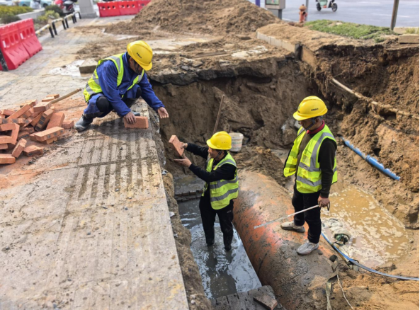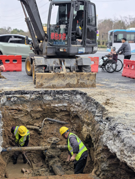 開挖管溝、鋪設臨時保供管道、主管網破口,連日來,乾坤大道老舊供水管網改造工程正在有序進行中。