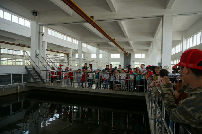 來到寬闊狹長的平流沉淀池邊,小記者們親眼看到在高分子聚合氯化鋁的作用下,原本渾濁的源水一點點變得清澈透明。在過濾車間,他們認真觀察濾池反沖洗和水質變化的過程;走進送水泵房,他們在水泵機組轟鳴的運行聲中,細心傾聽處理好的干凈自來水是如何送到千家萬戶的。