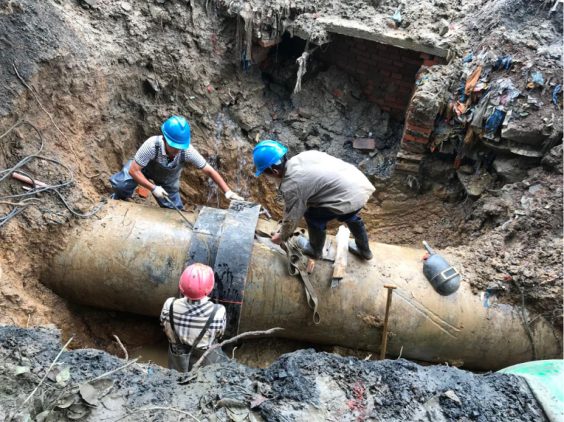 18日下午6點,DN800管道漏點終被挖出,原因是兩根水泥管道連接處經過天長日久的熱脹冷縮而發生漏水。考慮到停水作業將會影響用戶的正常需求,在管道挖出后,搶修人員發揮分工協作的高效作風,一組進行人工清理操作坑底和管上的淤泥,一組負責備料,一組關閘調水。下午7點,材料到位,操作坑內5名維修人員加緊手中動作,一刻不停進行管道清理、搶修節包裹、擰螺栓……19日凌晨,經過14個小時的緊急搶修,DN800供水管道維修工作順利完成,主城區全面恢復正常供水。