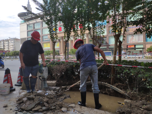 9月9日,我們跟隨搶修車輛來(lái)到了今天的第一站:乾坤商務(wù)酒店門口,由于管道漏水,現(xiàn)場(chǎng)不斷有水從地底滲出,加上地點(diǎn)特殊我們搶修工只能用鐵鍬等工具將道路破開(kāi),再找出破損位置,對(duì)管道進(jìn)行更換維護(hù)處理。